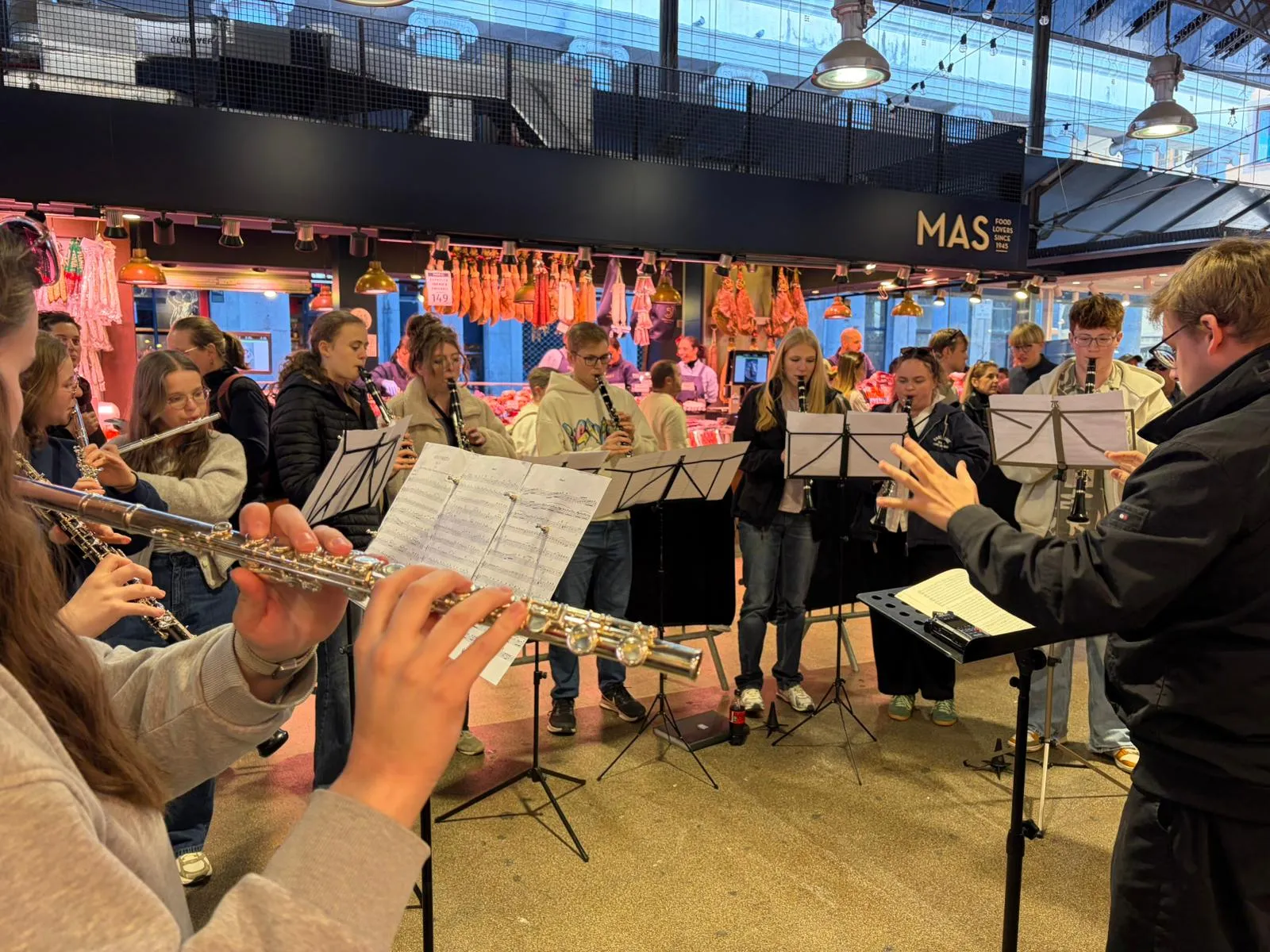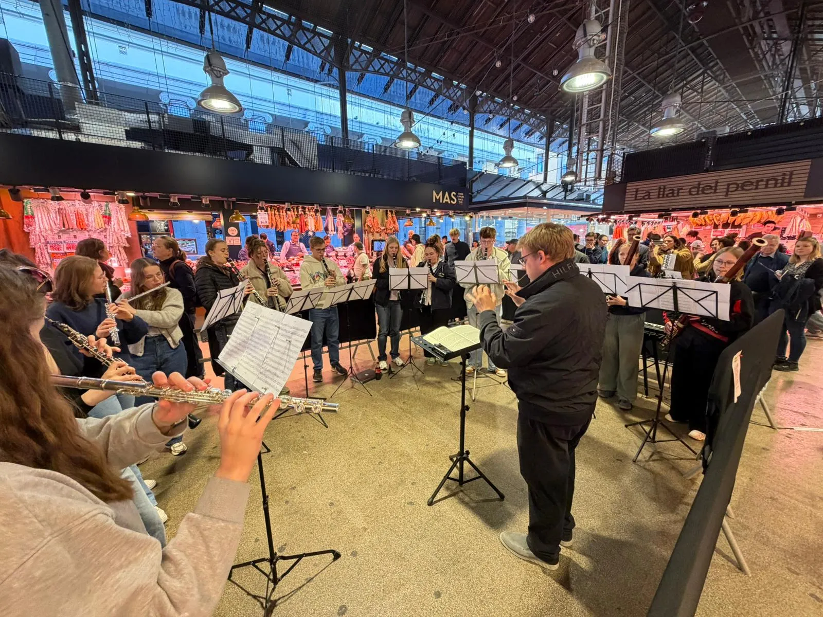 La clientela de la Boqueria s’ha trobat avui amb la sorpresa d’una doble actuació de l’Orquestra Simfònica de l’Escola Liebigschule de Gießen, un conjunt format per joves talents alemanys que combina excel·lència musical i treball en equip com a part fonamental de la vida escolar.