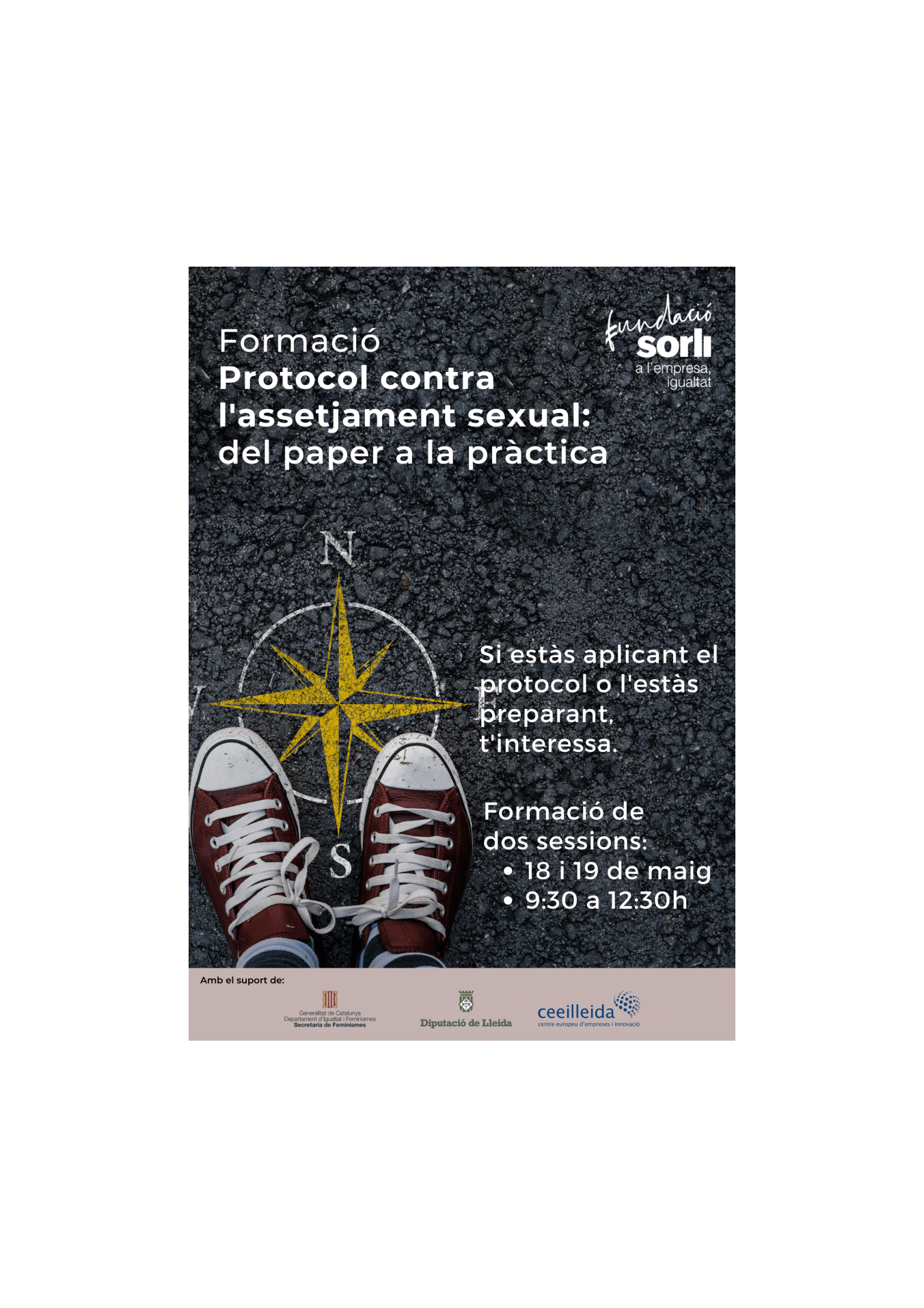 La Fundació Sorli ha posat en marxa el tercer cicle de formacions per a empreses del territori català, centrat en les diferents fases del protocol contra l’assetjament sexual en l’entorn laboral. Aquest mes de maig, la formació s’està duent a terme a la província de Lleida de la mà del CEEI (Centre Europeu d’Empreses i Innovació).