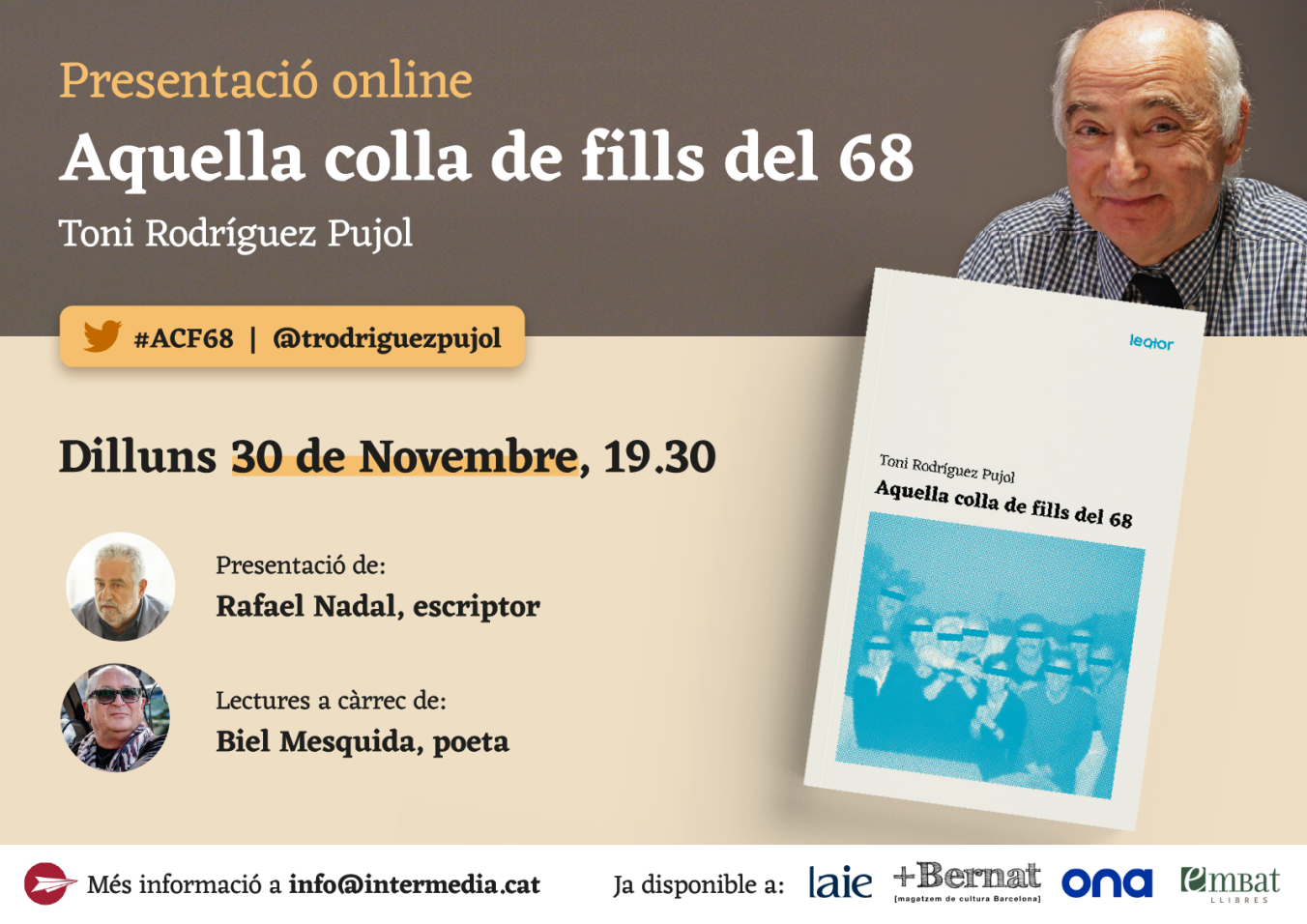 Al voltant d’un centenar d’assistents van participar al webinar celebrat dilluns 30 de novembre amb motiu de la presentació telemàtica de la novel·la “Aquella Colla d’Amics del 68”, escrita pel president executiu d’Intermèdia, Toni Rodriguez Pujol.