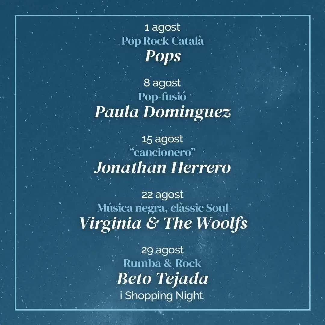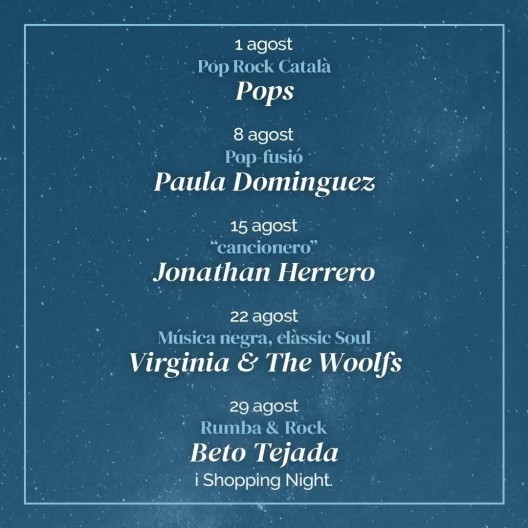 El mes d’agost començarà el dia 1 amb pop-rock català amb el grup Pops. El dissabte 8 d’agost estarà protagonitzat per Paula Domínguez, que portarà a Vilassar de Dalt el seu pop fusió. El dia 15 d’agost serà el torn de Jonathan Herrero que en aquesta ocasió ens presentarà un repertori totalment diferent i enterament en castellà. El dia 22 pujarà a l’escenari el grup Virginia & The Woolfs, que ens aproparà a la música negra dels 50, 60 i 70. El cicle es clourà el 29 d’agost de la mà de Beto Tejada, que ens portarà una festa de rumba i rock, en una nit en què el centre comercial de Sorli Emocions obrirà fins la mitjanit.