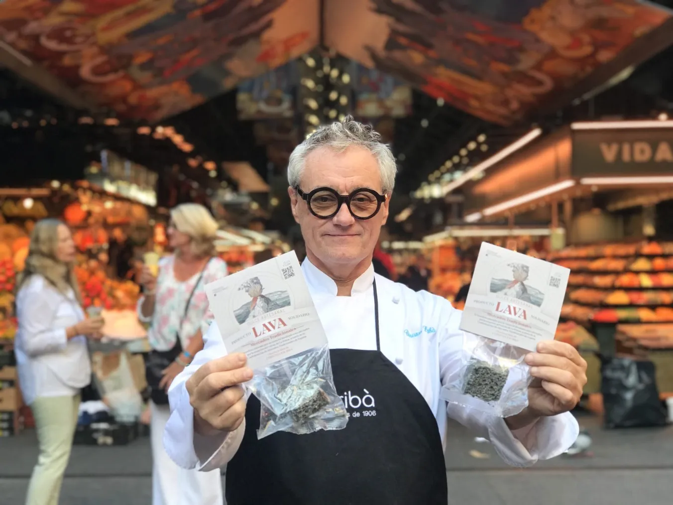 El Mercado de la Boqueria saca a la venta lunes 19 de septiembre una lava comestible con gusto de plátano ideada y elaborada por el maestro pastelero Christian Escribà, director de las pastelerías Escribà. Este producto solidario, creado a partir de carbón de azúcar, se presentó en Santa Cruz de la Palma.